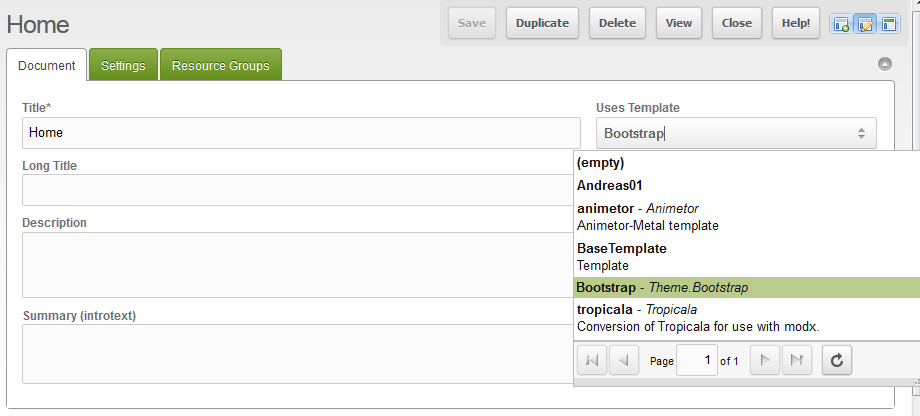 When the Modx template is loaded you will see that it is now available as an option in the drop-down menu when editing/creating documents. You can also see the list of files loaded in the resource tree under TEMPLATES. Use the templates in order to quickly develop a variety of pages for your Modx website. The following screenshots show the availability of a newly loaded templates and how they can be used to change your Modx page appearance: