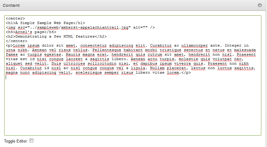 - Since the editor I am using is using a different editor, we will want to toggle the editor (the TinyMCE editor) off. This can be done at the bottom of left of the screen with the option labeled "Toggle Editor". Uncheck "Toggle Editor" so that we can see the code on the page. Here's a screenshot of what you may see: