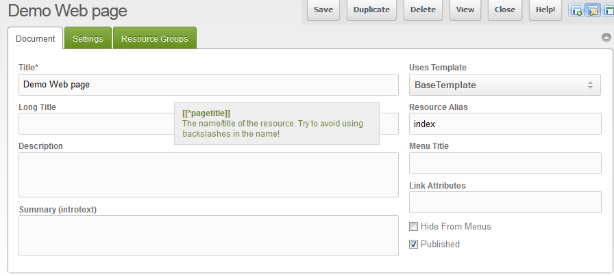 Note that if you hover over the fields, you can see a pop-up description similar to the one for [[*pagetitle]] in the above screenshot. We are looking at these settings in order to understand the correlation between the page and a template. When viewing the page that is created by Modx, you will see something similar to the following: