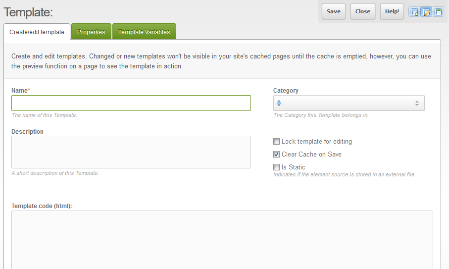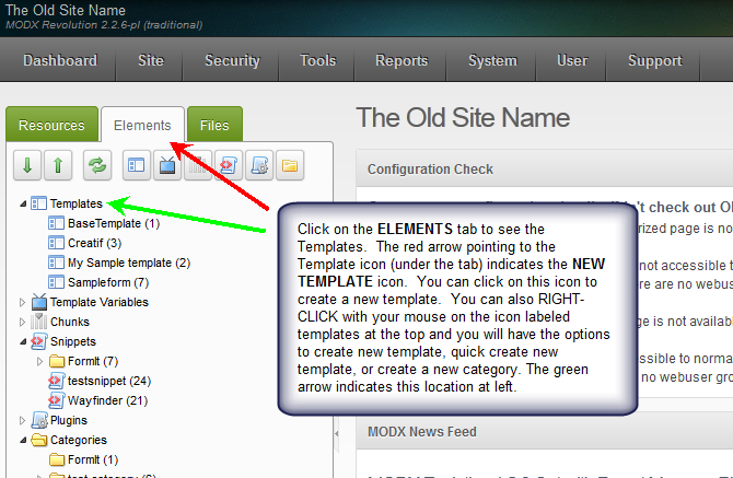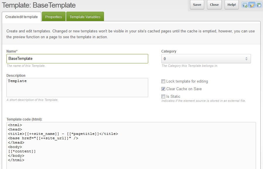 One of the strengths of Modx is its ability to use any number of templates for the construction of its front end website. You can assign each page a different template. Templates are basically HTML and CSS code with Modx Tags (see Commonly Used Tags in Modx for more information on Tags) to provide the structure and content of the webpage. Tags can be used to provide static or dynamic content on the page while the HTML and CSS provide the rest of the page design. The following tutorial will simply explain how to create a new template.