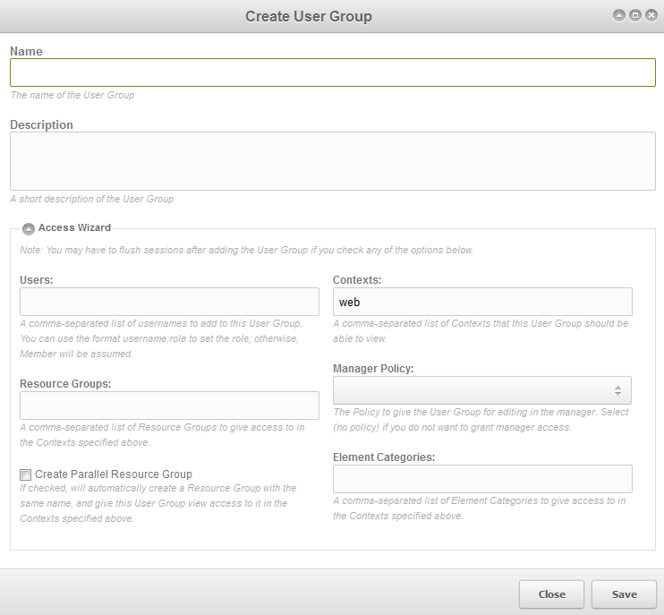 | Access Wizard | Note: This section may require that you flush sessions after adding a User group after filling the following options. This is necessary in order to properly the changed access policies to the users. You can find the Flush Sessions option at the bottom of the SECURITY menu. |