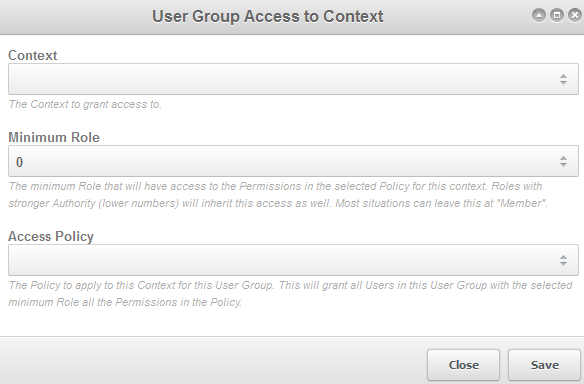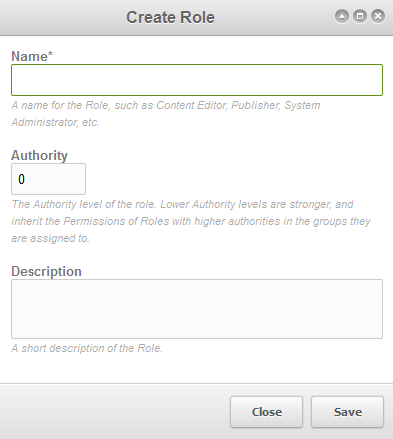 | Authority | The lower the integer applied, the higher the authority the role is given. As explained above, higher authority roles will inherit the permissions for roles that are also part of the usergroup definition. |