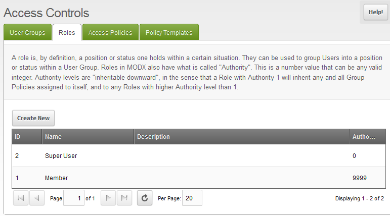 As in a play or a movie, roles are positions where people are given the responsibility to play a part. Like a role in a play, they may be only have access to parts of the entire story (which represents your website). Modx allows you to create roles so that you can then apply them to users. These roles can be hierarchical in nature - meaning that you can rank them so that they have a position within a user group. This is done by assigning what Modx defines as authority to each role. Authority is given an integer value and is "inheritable downward." For example, if you give a group admin user an authority of 10 and then have another role called group moderator with an authority of 15, the group admin user would inherit all of the roles assigned to the group moderator. And if there was a Super Admin group that had an authority of 1, then they would inherit of all of the roles ranked lower. The lower the authority number, the higher the authority of the user.