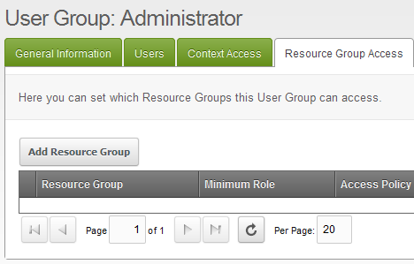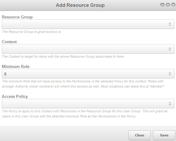 | Access Policy | Select a defined Access Policy for the Resource in the Resources group. Note that permissions in the policy apply to all Users in the user Group |