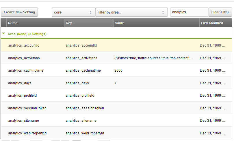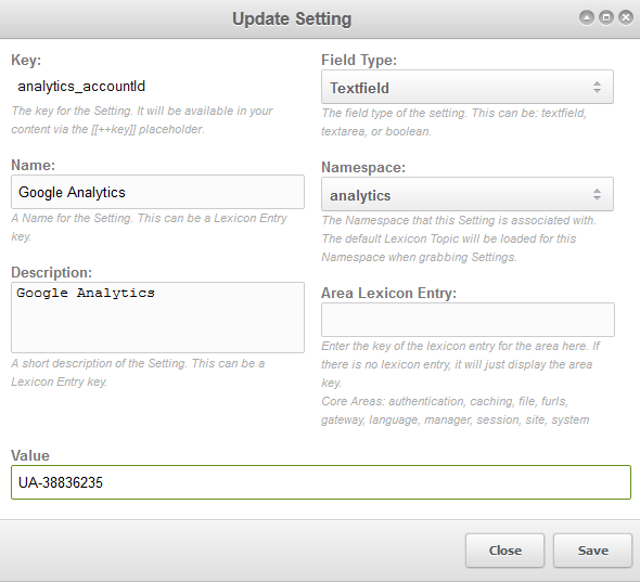 In order to operate Google Analytics, you will need to create or a Google Analytics account. When you have your account ID, right-click on the System Setting labeled: Google Analytics (key = analytics_accountID). Select UPDATE SETTING.