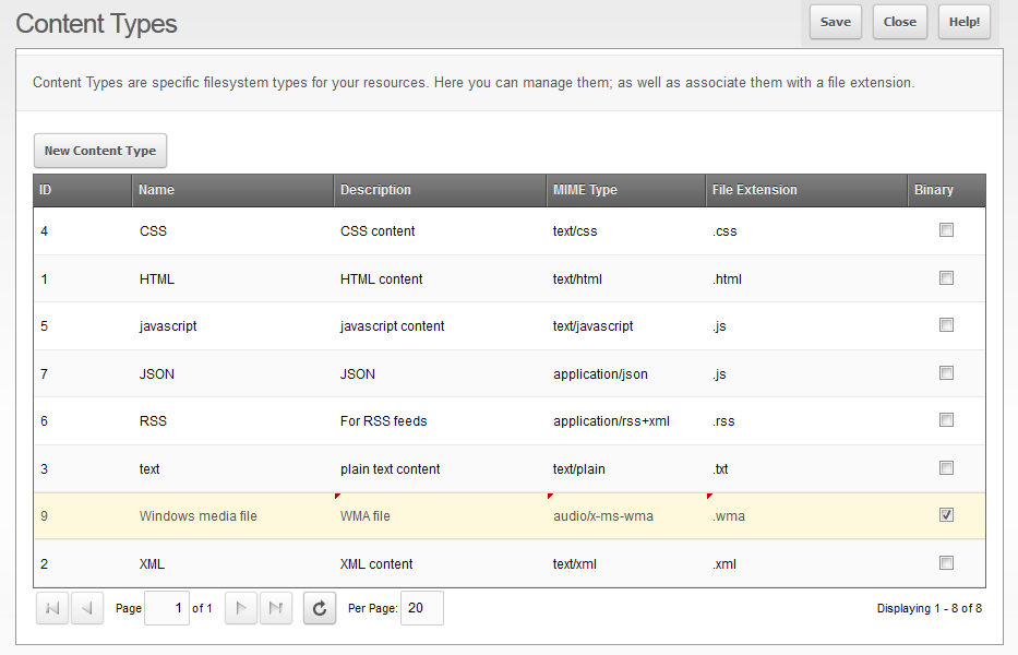 The following screenshot shows an example of a new content type that has been added. The content type is a Windows Media Audio file or WMA file. The Content Settings for this file type are audio/x-ms-wma (specific details for MIME settings of Windows Media files can be found here: MIME Type Settings For Windows Media Services). Note that each content type entry can be modified. To edit the entry, simply double-click on the text entry and an editable field will appear with the current setting. When the entry is edited, you will see a red triangular mark appear above it as in the screenshot below. When you have finished making your changes, simply click on SAVE in the top right hand corner and the marks will disappear and you changes saved.
