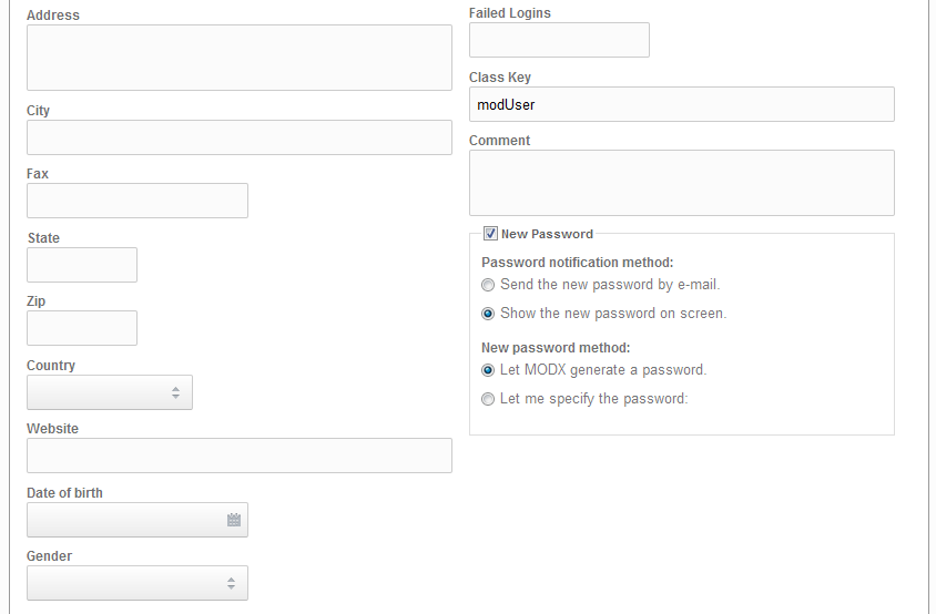 Note: The minimum required information before you can save the user is the user name, full name, email address, and select ACTIVE (so that the user can login). If the password is being generated by Modx, then it will appear when you click on the SAVE button in the top right hand corner. If the new password method for Modx is set to "Let me specify the password", then the password will be required before you can save the user.