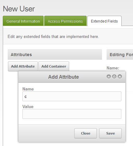 - Click in the Name and Value fields for the Attribute and add the appropriate values that you need to define. These are typically values that you need to assign to the user that are no already in the General Information tab.