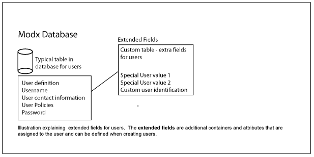 The illustration doesn't provide a direct correlation for the database tables. It is more an illustration of how the extended fields are not a part of the usual definition of the users and can be added as a container and attribute using the interface provided in the Extended Fields tab. This allows you to extend the definition of your user information without having to modify the core database structure. This is important for future Modx upgrades. If you're adding tables or entries that change the database structure, then you may interfere with future upgrades to the software.