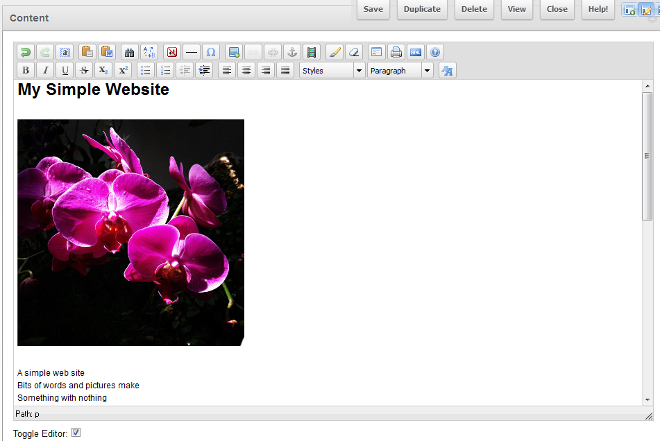 The new toolbar that you see at the top is the interface for the newly installed TinyMCE editor. To learn more about using the editor go to Adding Text and Graphics with the TinyMCE Editor in Modx.