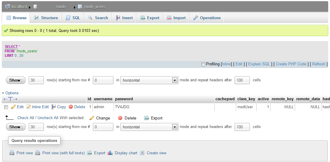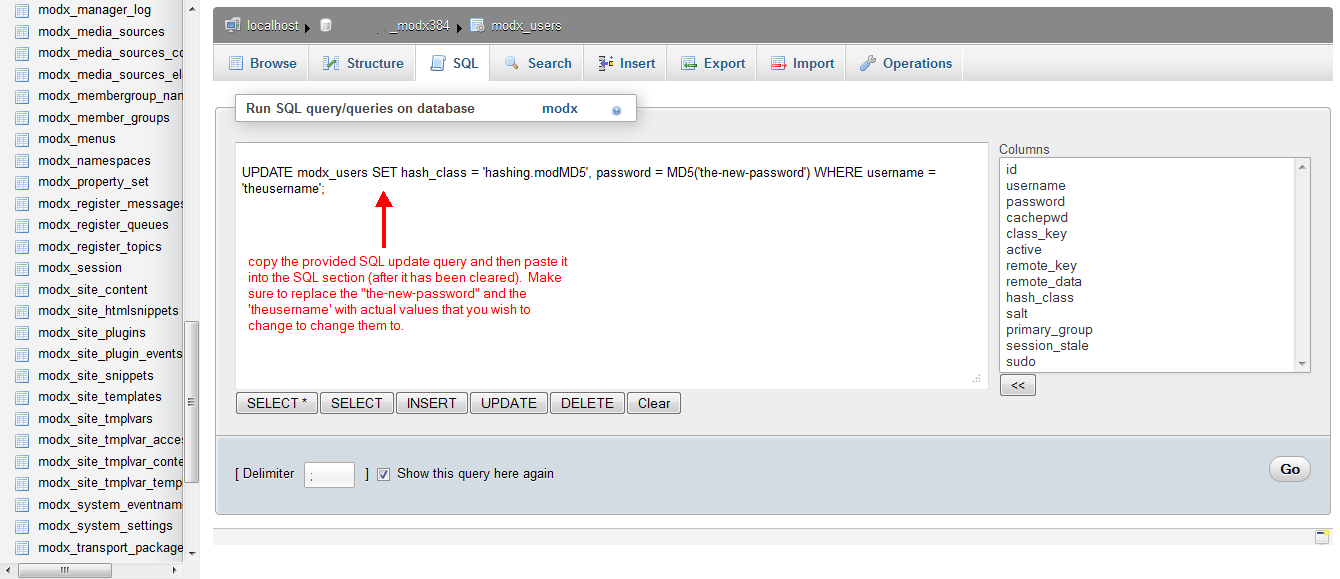 The code above also includes the update query for the password that you need to change. You will need to know the user name in order for the query to work. Note that this query will only work with Modx 2.1 and greater (Web Hosting Hub only has the installation files for the newer versions of Modx).