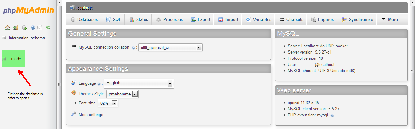 Note: Manually changing the passwords for Modx Revolution requires access Cpanel and phpMyAdmin. For more information on using phpMyAdmin, please see Managing Databases Through phpMyAdmin