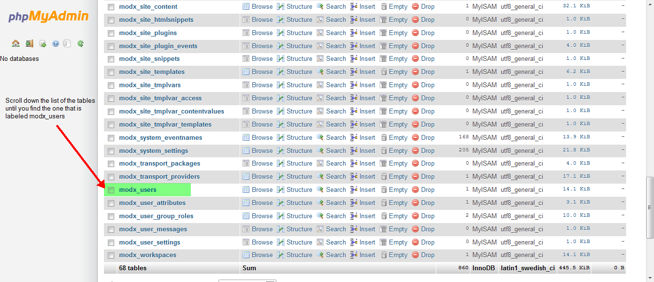 Before you begin, you will nee to obtain the update query for changing the hash that is used to encrypt the password. By default the hashing class is set to use PBKDF2, but this type of hash is not available in phpMyAdmin. Fortunately, Modx lets you change the hash class to MD5, which CAN be used in phpMyadmin. Modx provides the mySQL update query here: