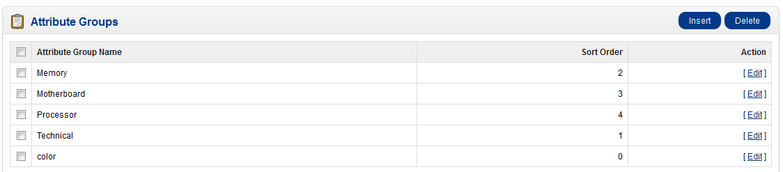 In order to Create a NEW Attribute Group, click on INSERT in the top right-hand corner. Editing an attribute just means that it has a previous definition and you would be editing that entry. Here's an example of what you would see: