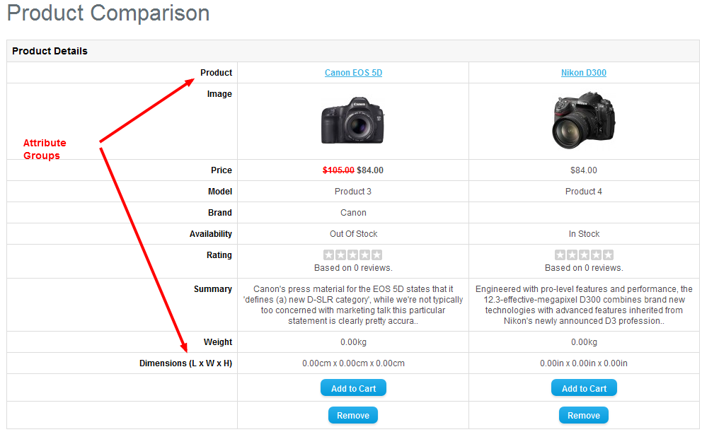 Attribute groups can best be seen when using the Product comparison option in the OpenCart Storefront. The screen shot below illustrates where the Attribute groups appear.