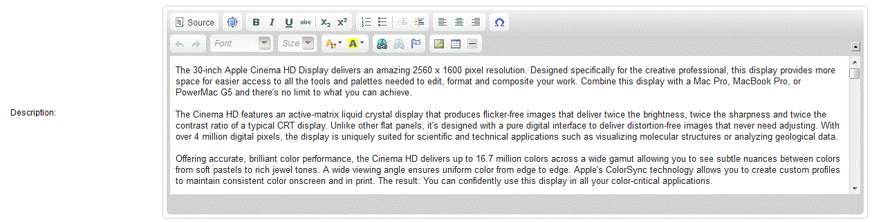 While it is not required, the product description still remains as one of the most important text fields in your store since it describes the product to your customers. Make sure you are using an accurate description for your product, as well as making it easy to read. For more information on adding products to OpenCart, go to the Overview of Adding a Product to the OpenCart 1.5 Administration Dashboard.
