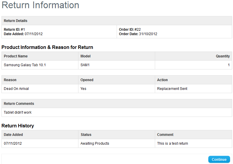 The customer sees a history of the RETURN by logging into their account. They can see Retuns in their store interface and will see the following: