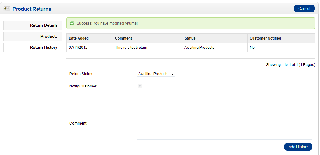 - If you are updating the product return, make your entry, then click on ADD HISTORY in order to make the update. If you have nothing to report and just wish to leave the screen then click on CANCEL. This will return you to the initial table listing all of the returns.