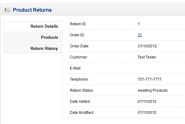 After adding several product returns, you may find it necessary to manage the returns. Using the Administrator Dashboard interface, it's very easy to update, view or delete a product return. The following tutorial explains how to manage product returns in OpenCart 1.5.