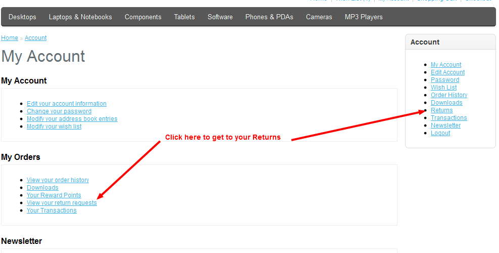 Managing product returns includes editing, deleting and viewing returns. As product returns come in, it is important to be aware of these issues in order to determine if there is a problem trend for your customers, or if there are possible issues with your products. Keep all returns up-to-date and relevant so that you can avoid any possible conflicts with your customers or vendors. Editing Product returns keeps you in touch with your customer base and aware of any possible complaints. Here's a sequence of how the user will login and get to the Return screens in the storefront: