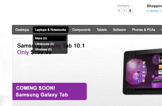 In the above store front screenshot, the menu items for the categories of Macs, Ultrabooks, Windows are in alphabetical order as per the SORT ORDER setting of 0.