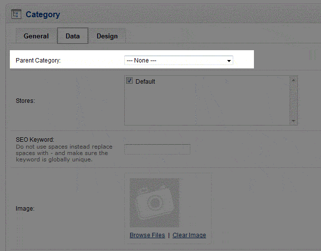 - When you get to the DATA tab you will see that the PARENT CATEGORY is at the top of the screen. Select the category in the drop down menu which best fits your product, or select none if nothing fits and you want this category to be a top level category
