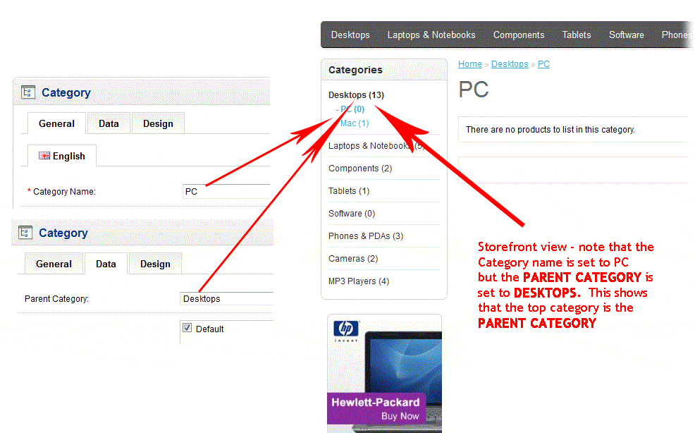 What happens when you set the PARENT CATEGORY? Here's an example set of screenshots where the CATEGORY NAME is set to "PC" and the PARENT CATEGORY is set to DESKTOPS. The right side of the screenshot shows what you would see as a customer in the storefront: