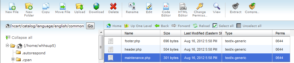 Inside the common folder you will see three files. Highlight the one named maintenance.php and open it for editing.
