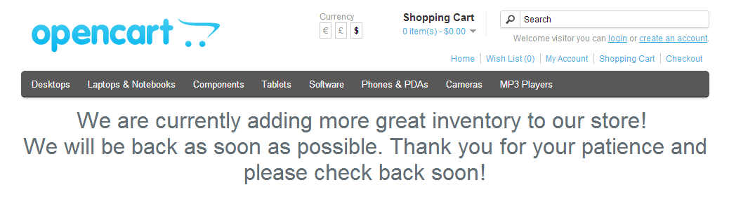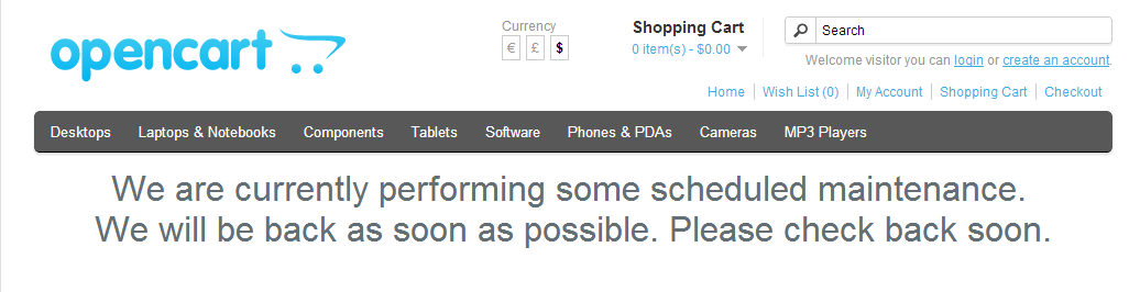 When you are making changes in your OpenCart store, you may want to set it to maintenance mode. This keeps visitors from being able to shop your store while you make changes. There is a default message that displays when your store is in this mode. If you wish to customize this message to be more specific, you must change a variable in the maintenance template file. This tutorial guides you on how to edit your maintenance message in OpenCart 1.5