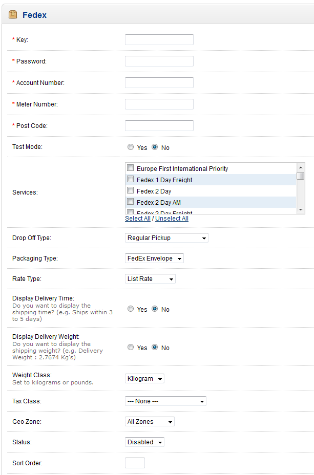 | Sort Order | Allows you to determine where the Fedex shipping option is listed |