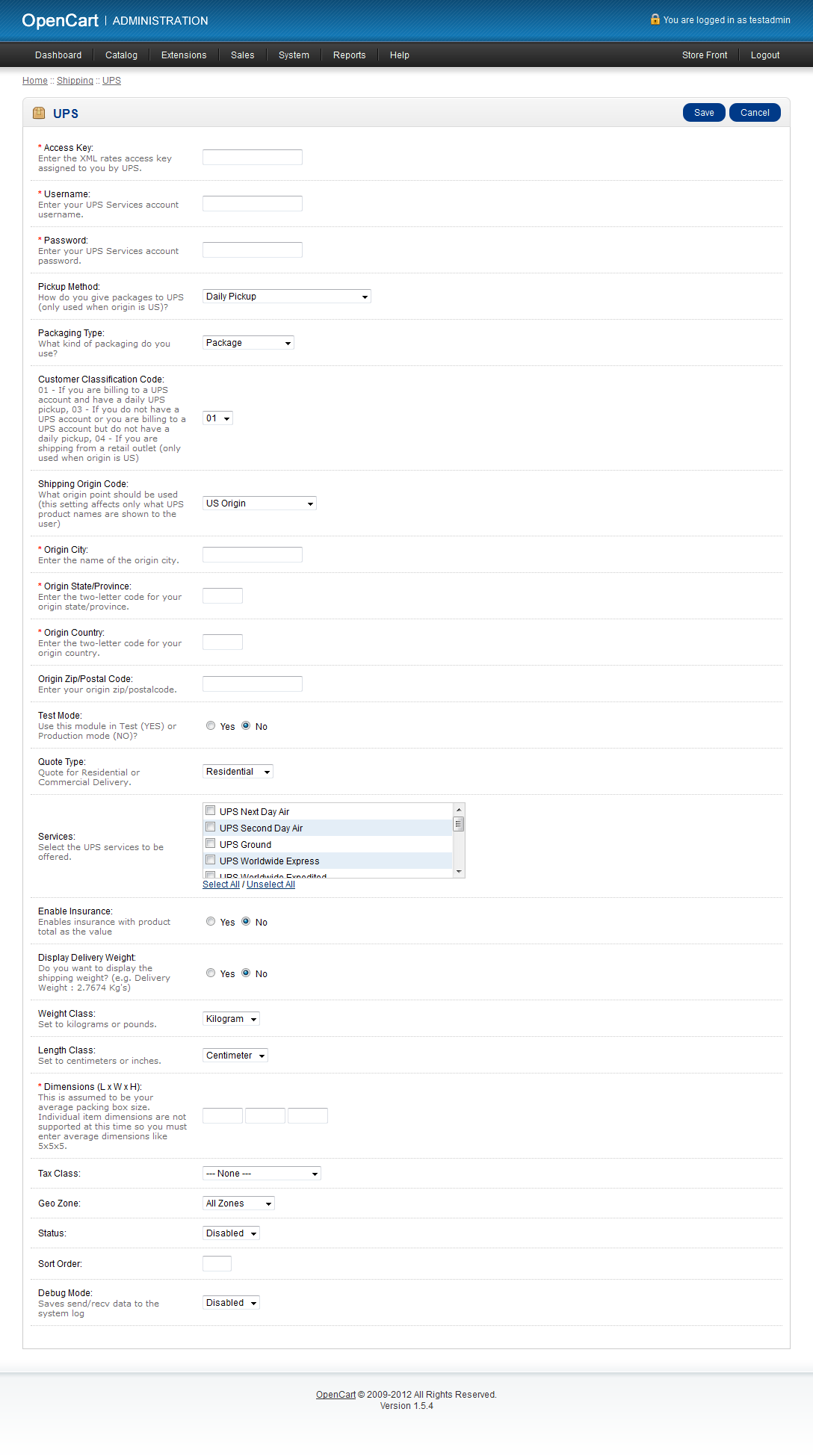 OpenCart is installed with a variety of shipping solutions, but for the most part, they are not enabled. You will need to log-in the Administrator Dashboard, determine the shipper/carrier that you want provide as an option for your customers and then setup the shipping option accordingly. One of the more popular options is the United Parcel Service or UPS. You will need to have an account in order to complete the process of setting up this carrier option. The following tutorial explains how to enable the shipping option and configure it in Opencart 1.5.