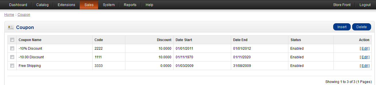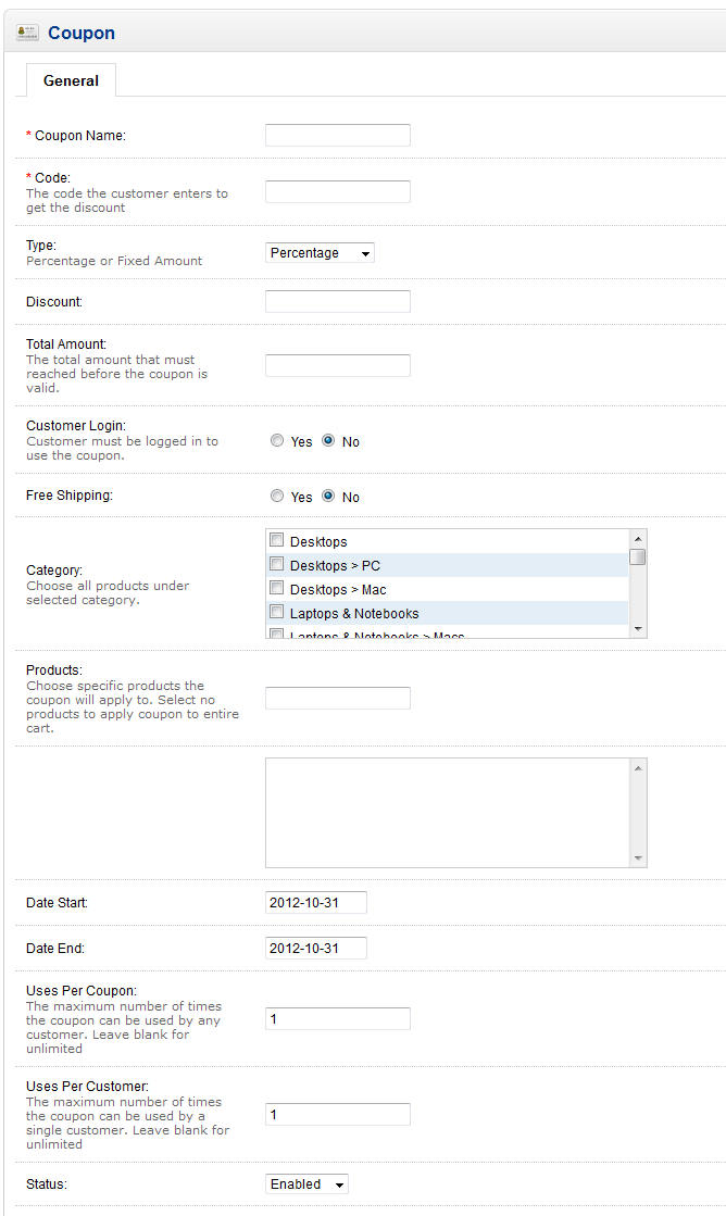 The main items we will be discussing are the limiting factors for their use. OpenCart lets you set limits on coupon use by allowing you to define the start and and end date during which a coupon can be used. You can also limit a coupon PER COUPON or PER CUSTOMER.