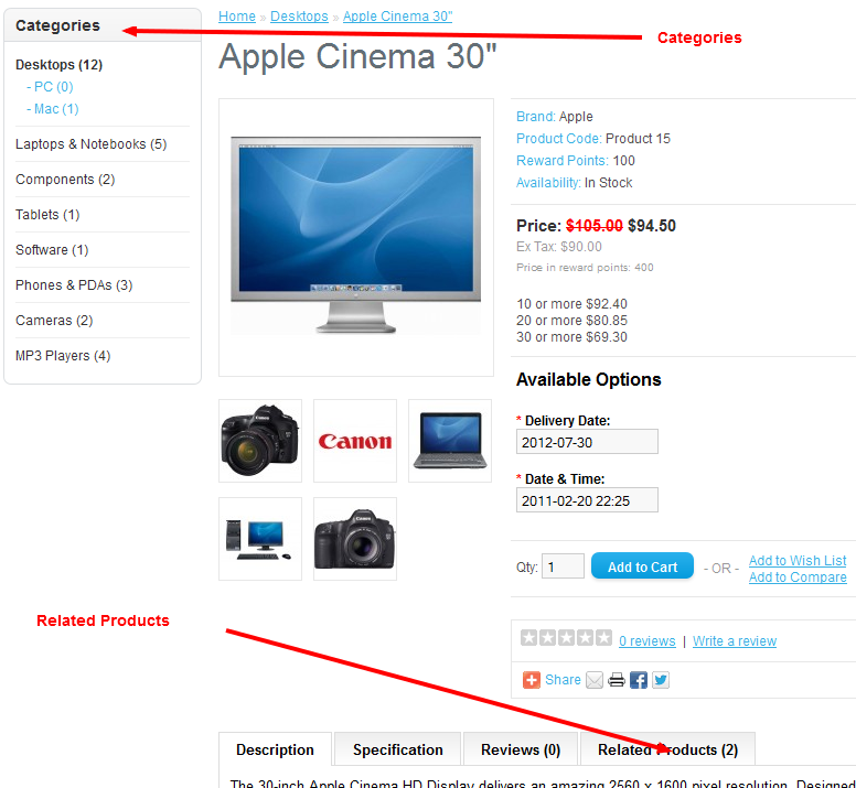 Product links are important in helping to make it easier to products by linking it to categories or manufacturers. Links also help to promote other products in your inventory by linking to them as related products. Here's an example screenshot of the storefront that a customer would see. The product is the Apple Cinema 30" screen and it shows up under the Desktop category and is related to other products shown by the "related products" tab: