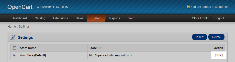 You are now on the Settings page for store selection. From here, select the store you are going to work with. In many cases, there will only be one. Click the Edit link to the far right of your selected store to access the main settings area.