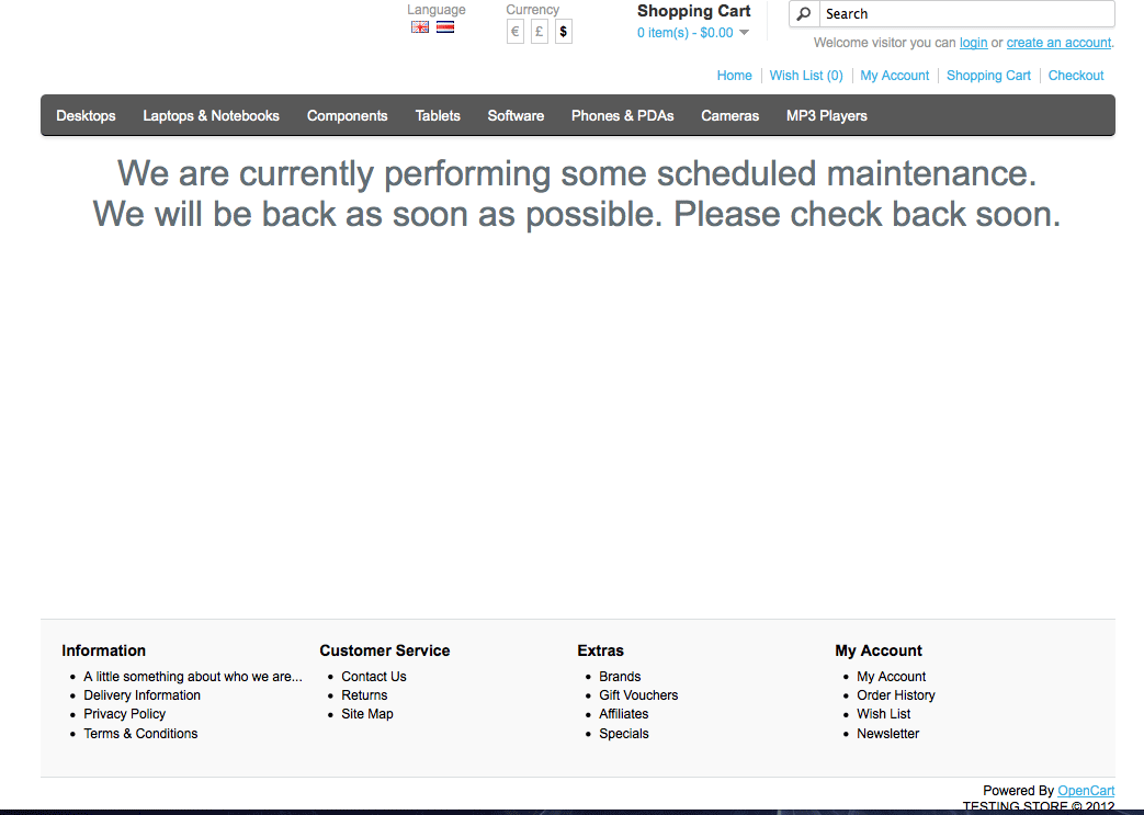 Customers often request some way of disabling access to their online store while they make a change. Or, more often, the request is to develop the store without anyone being able to see it until it is complete. This has been such a common request that one of the functional changes in many content management sysems or e-commerce applications like OpenCart has been to provide a mode where by only the Administrator can access the store. This mode is very commonly known as maintenance mode. The following article discusses how to activate or de-activate this feature in OpenCart 1.5.