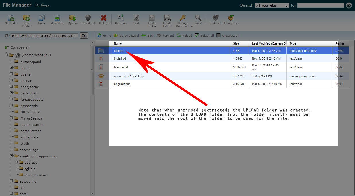 - Opencart 1.5 creates an UPLOAD folder which will be the location of the files for the installation. You may need to move the files OUT of the folder and into the actual installation folder that you are using. For example: You may have uploaded the files into the PUBLIC_HTML folder, but upon EXPANDING/UNZIPPING the file, the Opencart installation files will be in an UPLOAD folder. So the path to the installation files would look like this: