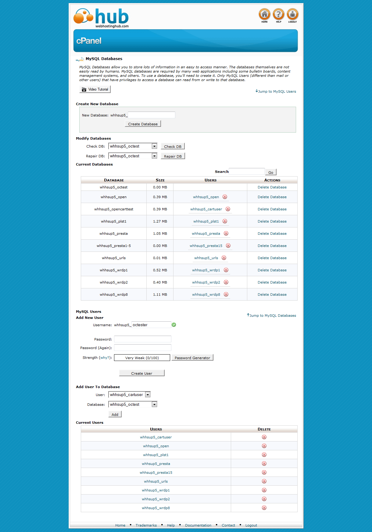 - Moving down the screen go to the User section and create a new user. The user name will also be prefixed by the Cpanel user name. SECURITY REMINDER - DO NOT USE YOUR USER NAME AND PASSWORD USED FOR YOUR WEB HOSTING ACCOUNT. Make sure to write down both the database name, user name and password so you don't forget it.
