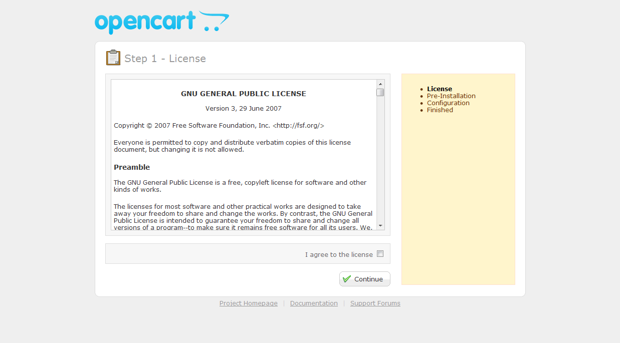 - The rest of the instructions will be based on screenshots directly from the OpenCart 1.5 installation. Go to the URL that you are using for the store home page and follow the onscreen instructions. Your very first step is to read and then agreee to the license