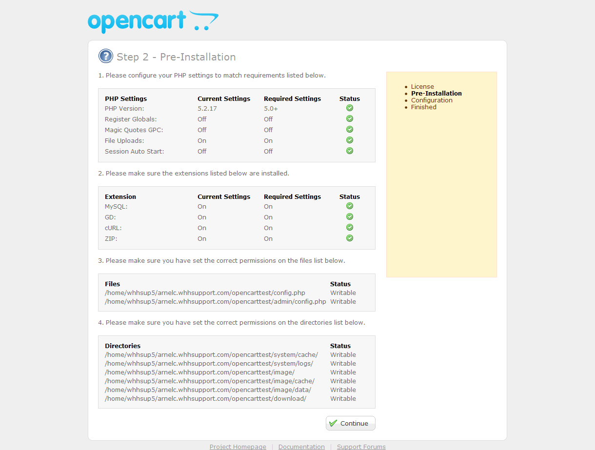 - Check to see that all requirements are met and files/folders are writable. You will see it noted here if something is not correct