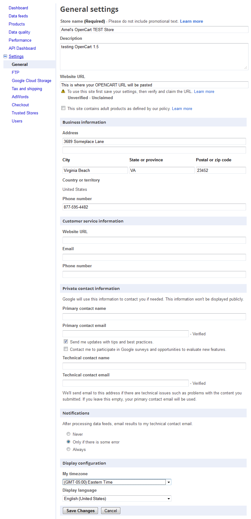 - Select OTHER RESOURCES, then go to Google MERCHANT CENTER, you will first be required to setup the General settings for your store starting with your URL. This URL is provided in OPENCART when you select Google Base or Google Sitemap in Product Feeds. Here's what the screen will look like: