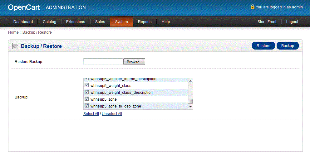 OpenCart 1.5 conveniently provides the ability to backup or restore database files within its interface. The following tutorial will guide you in using these options.