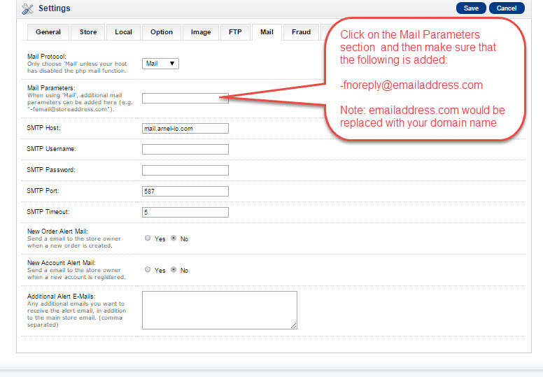 Click on the blank in Mail Parameters and then type the following: This email address is being protected from spambots. You need JavaScript enabled to view it. . You will need to replace "emailaddress.com" with your domain name. For example, -fnoreply@mydomain_name.com
