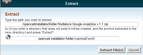 The path that you can alter is at the bottom. You can extract the folder wherever you wish, but the key file that you will need to reach is vqmod_multi_google_analytics.xml. If you run the extract routine in a folder on your server, you will see the following file folder contents: