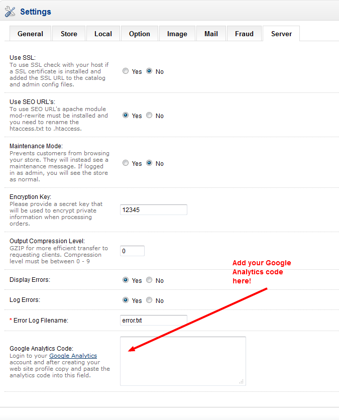 - This extension made so that you could add multiple Google Analytic Tracking codes - one for each store. Select the store where you wish to add the code, then click on the SERVER tab. You will see the following: