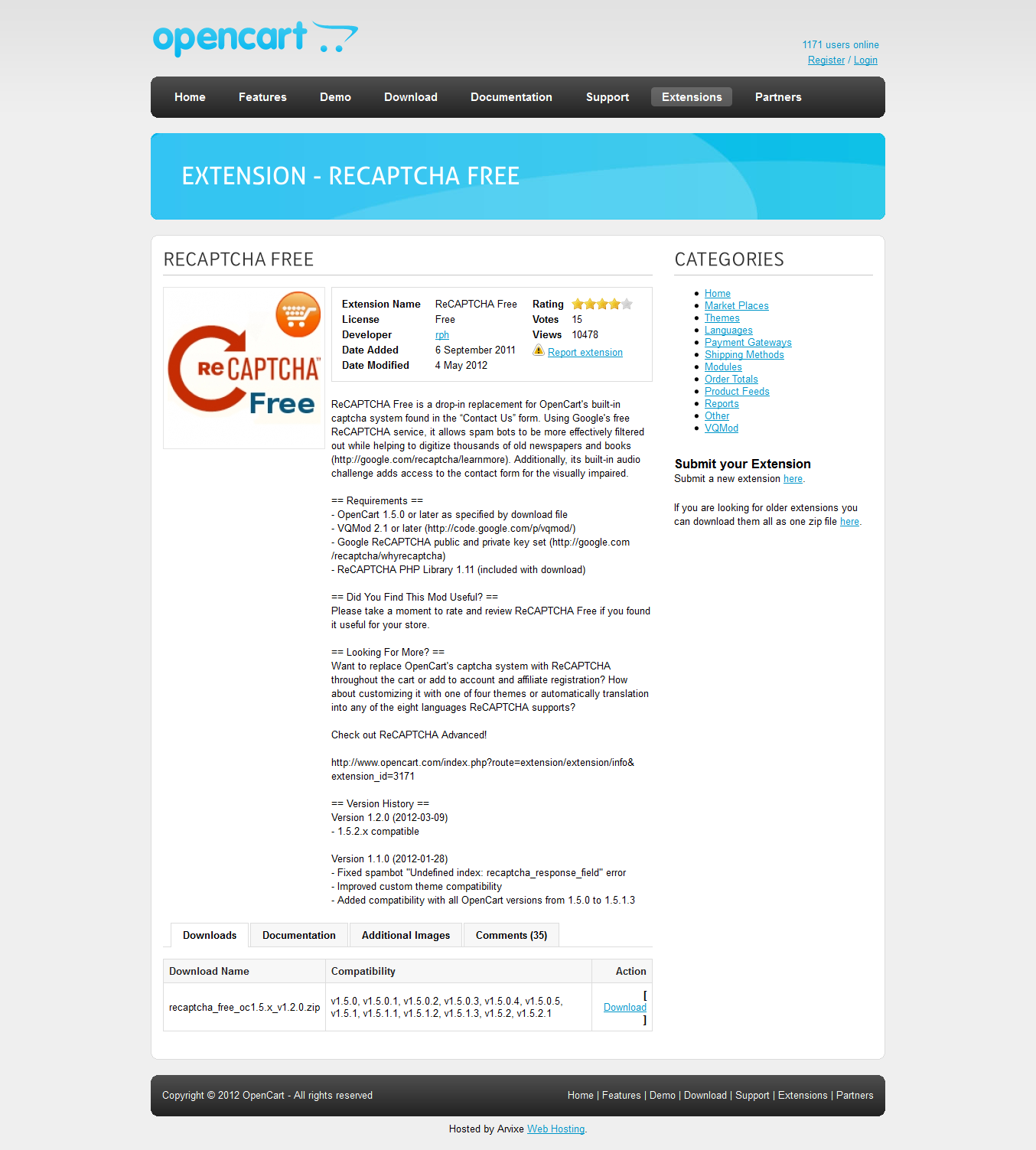 - The homepage for the ReCAPTCHA Free extension for Opencart will describe the extension. Scroll to the bottom of the screen and then click on DOWNLOAD under Action in order to download the zipped extension file.