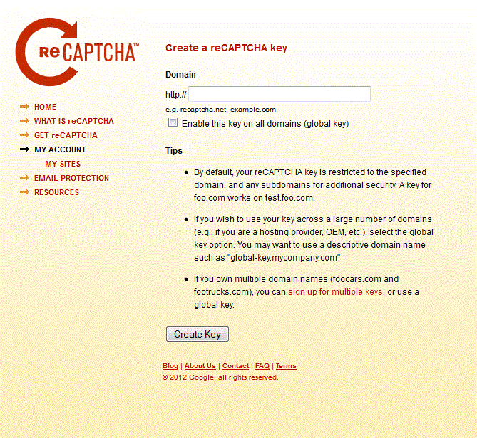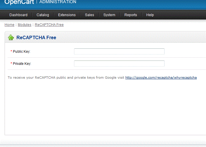 - Using a SEPARATE browser window (or tab) go to the URL to obtain the Google public-private key set: http://google.com/recaptcha/whyrecaptcha.Follow the instructions on the screen to generate the apporpriate keys for your installation. Copy the keys so that you can copy and paste them into the OpenCart installation