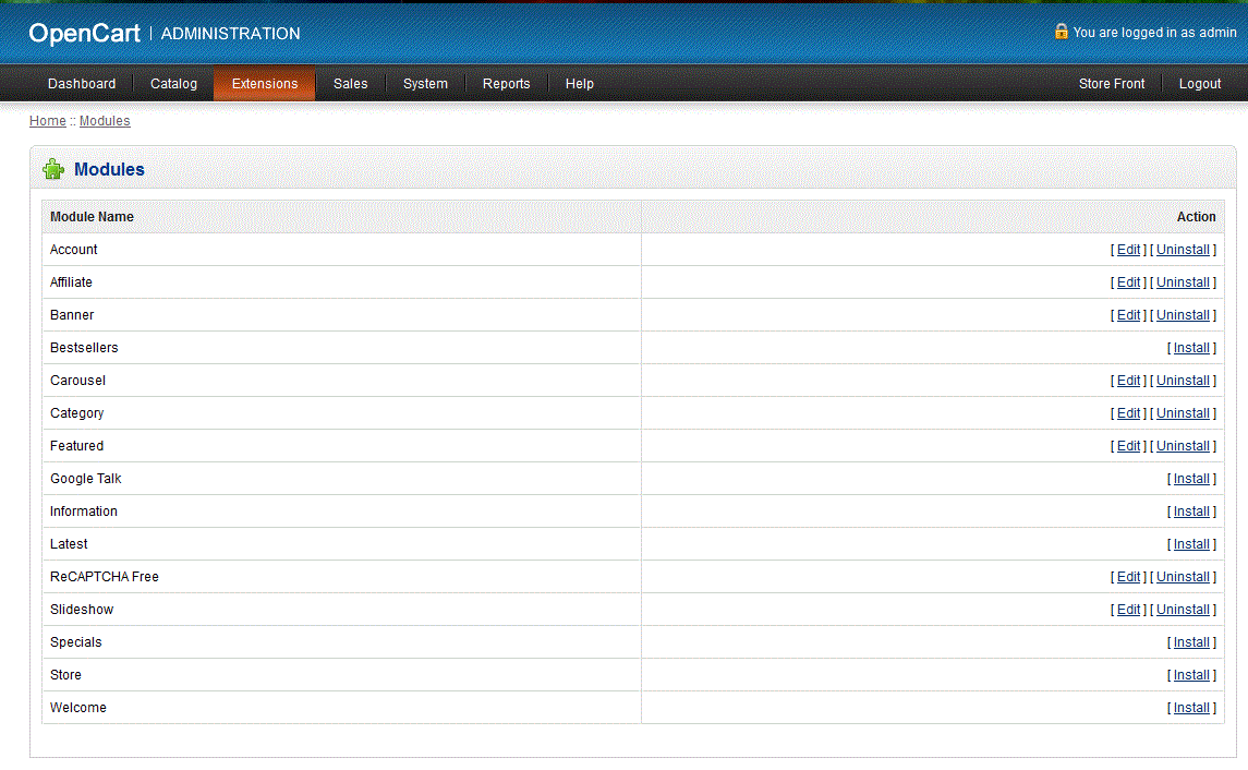 - You will see a list of the EXTENSIONS that are available or installed into your OpenCart installation. Look for RECAPTCHA FREE and then select EDIT.