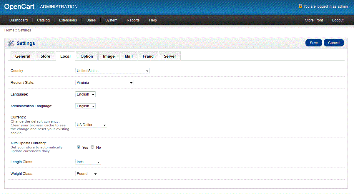 The Local settings in the OpenCart 1.5 Administration Dashboard include Country, Region/State, Language, Administration Language, Currency, Auto Update Current option, Length and Weight units. The following tutorial shows you how to quickly make the change to each of these values.
