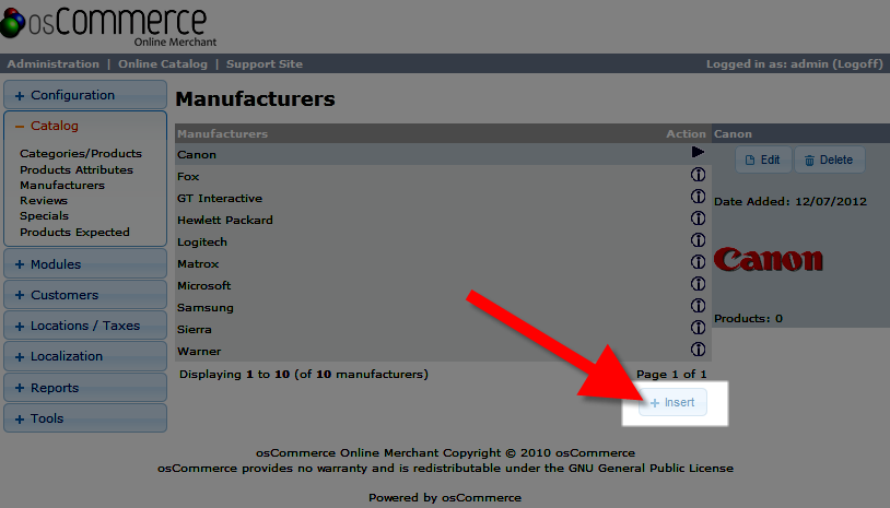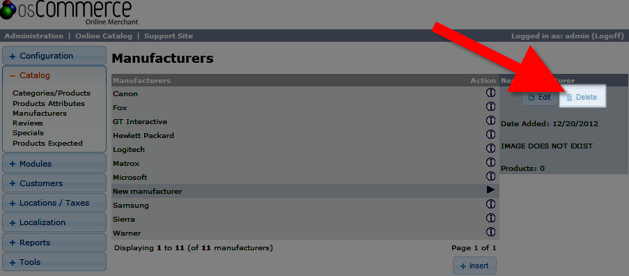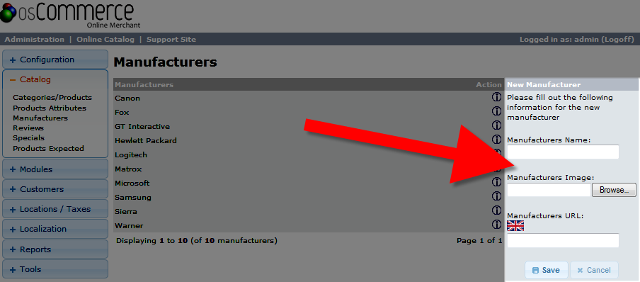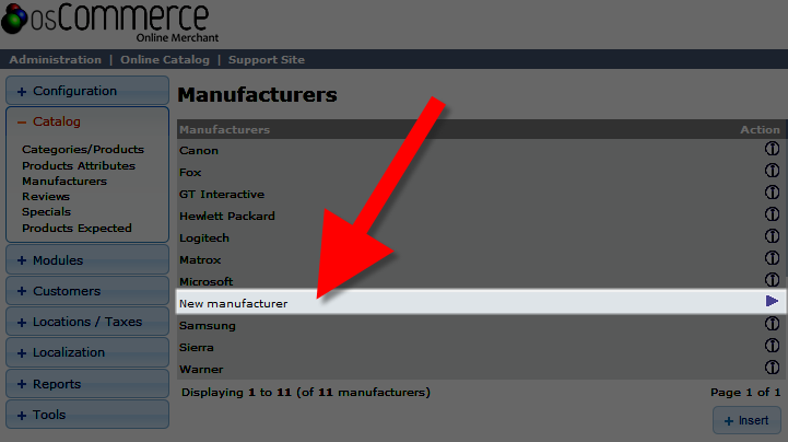 In this tutorial we will show you how to add a new manufacturer, or remove an existing manufacturer in osCommerce. When you are adding a product in osCommerce you can only choose a manufacturer from the available drop-down menu. We will now guide you through adding a new manufacturer from the Administration panel of oscommerce.