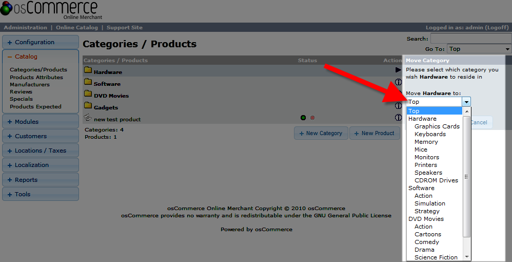 - OsCommerce will state "Please select which category you wish Hardware to reside in" and after Move Hardware to: click the drop-down box, and choose where you want your selection moved.